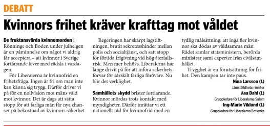 Publicerade debattartiklar om kvinnofrid